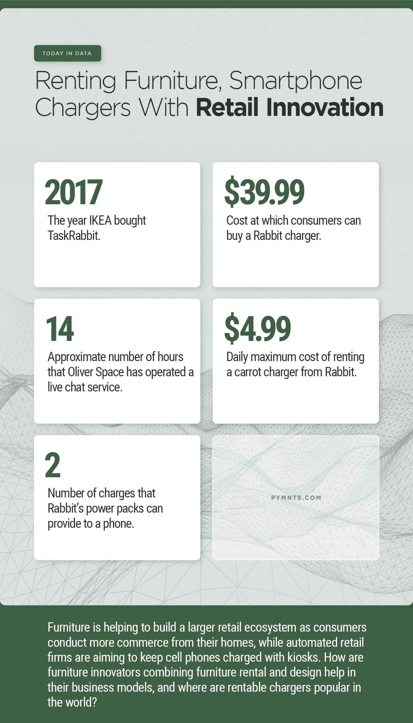 Furniture is helping to build a larger retail ecosystem, with the value proposition of Oliver Space centered around providing furnishings, along with design help, to consumers who are moving. The company, for its part, provides furniture to customers in exchange for monthly fees from customers. And in technology rentals, kiosks with rentable chargers are everywhere in China, and companies such as Rabbit are offering them in the United States. All this, Today in Data.