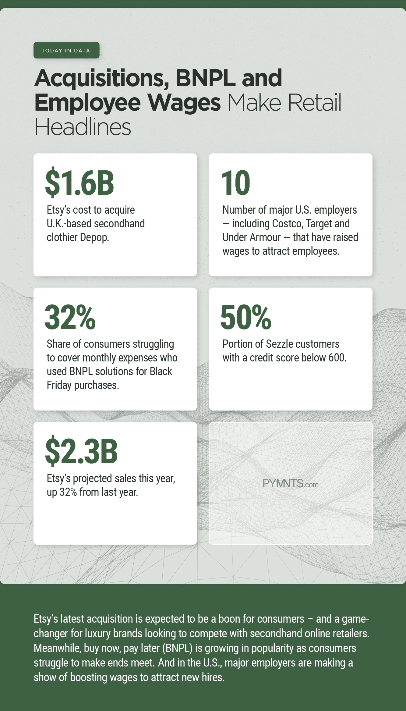 Etsy’s latest acquisition is expected to be a boon for consumers – and a game-changer for luxury brands looking to compete with secondhand online retailers. Meanwhile, buy now, pay later (BNPL) is growing in popularity as consumers struggle to make ends meet. And in the U.S., major employers are making a show of boosting wages to attract new hires.
