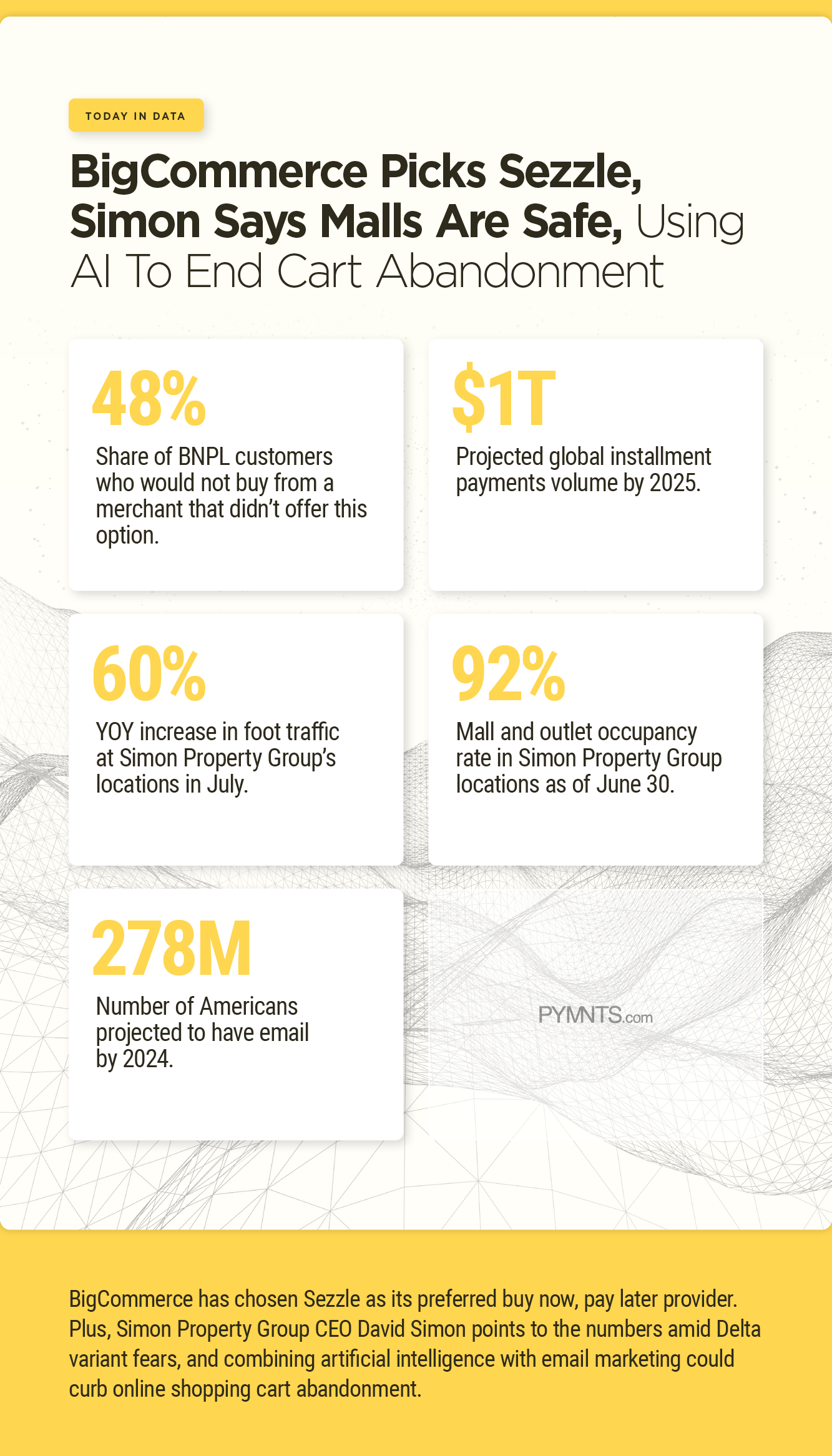 BigCommerce has chosen Sezzle as its preferred buy now, pay later provider. Plus, Simon Property Group CEO David Simon points to the numbers amid Delta variant fears, and combining artificial intelligence with email marketing could curb online shopping cart abandonment.