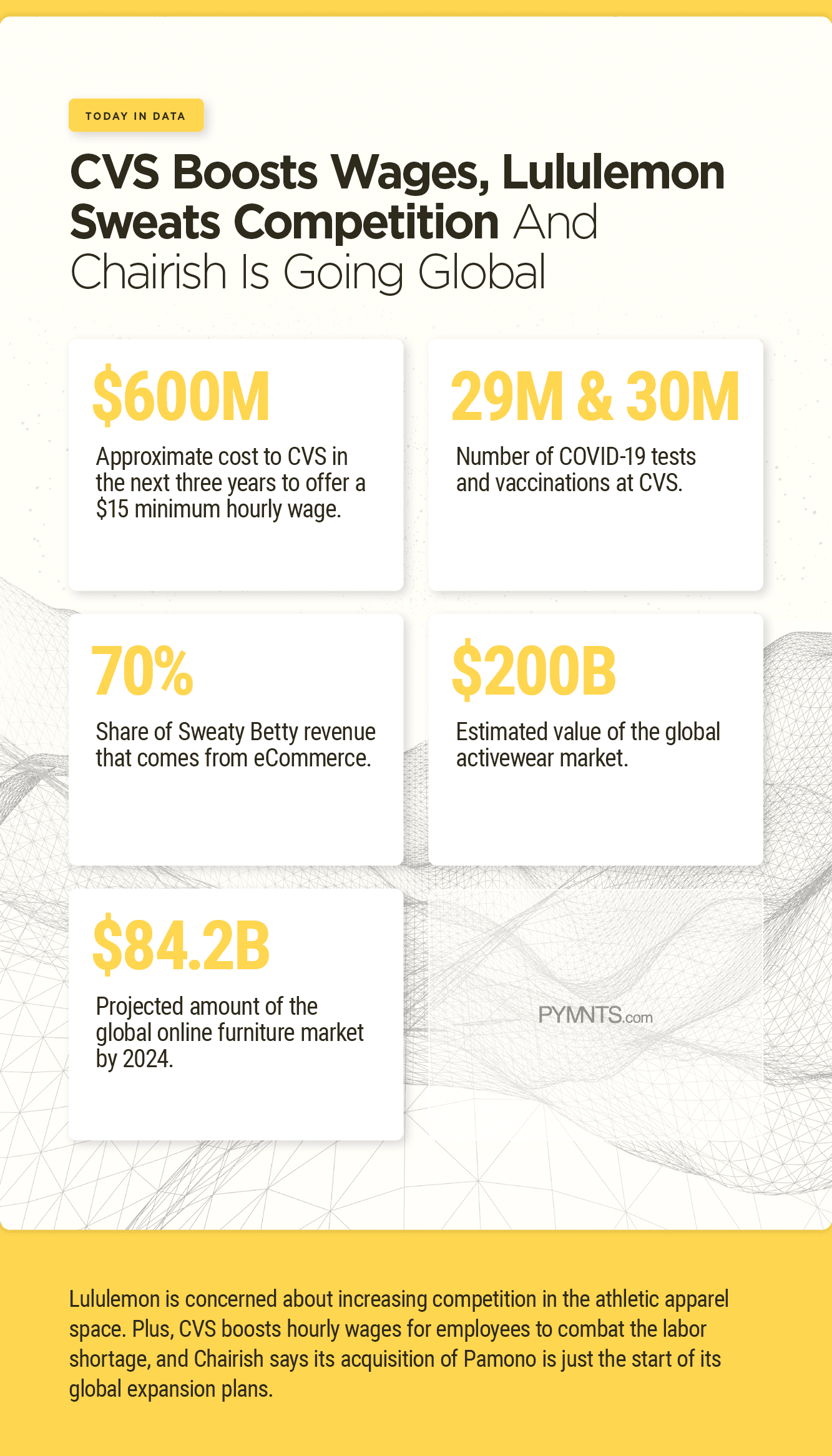 Lululemon is concerned about increasing competition in the athletic apparel space. Plus, CVS boosts hourly wages for employees to combat the labor shortage, and Chairish says its acquisition of Pamono is just the start of its global expansion plans.