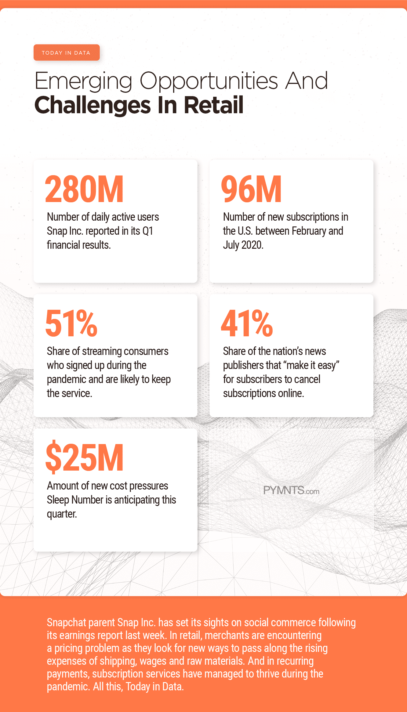 Snapchat parent Snap Inc. has set its sights on social commerce following its earnings report last week. In retail, merchants are encountering a pricing problem as they look for new ways to pass along the rising expenses of shipping, wages and raw materials. And in recurring payments, subscription services have managed to thrive during the pandemic. All this, Today in Data.
