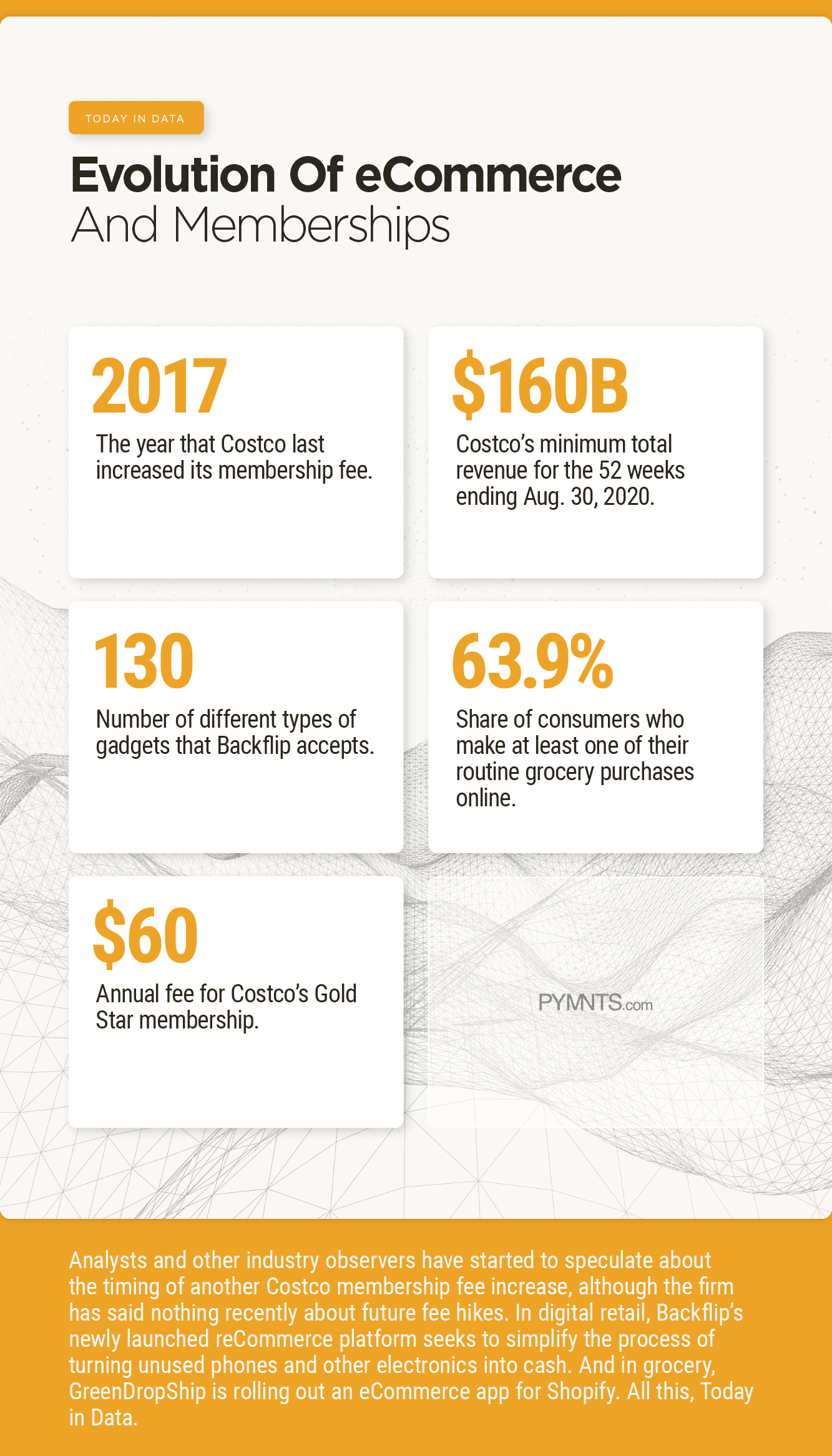 Analysts and other industry observers have started to speculate about the timing of another Costco membership fee increase, although the firm has said nothing recently about future fee hikes. In digital retail, Backflip’s newly launched reCommerce platform seeks to simplify the process of turning unused phones and other electronics into cash. And in grocery, GreenDropShip is rolling out an eCommerce app for Shopify. All this, Today in Data.