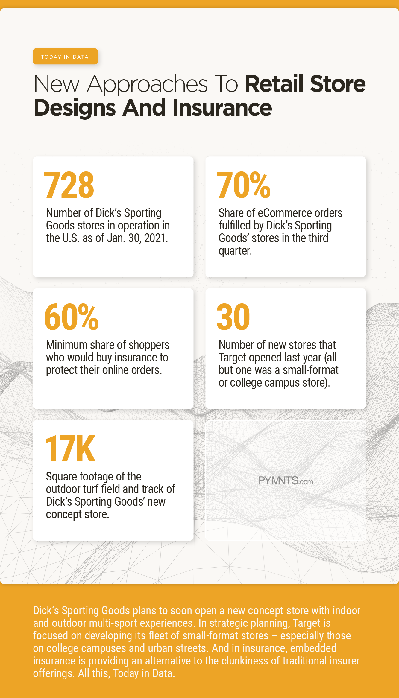 Dick’s Sporting Goods plans to soon open a new concept store with indoor and outdoor multi-sport experiences. In strategic planning, Target is focused on developing its fleet of small-format stores – especially those on college campuses and urban streets. And in insurance, embedded insurance is providing an alternative to the clunkiness of traditional insurer offerings. All this, Today in Data.