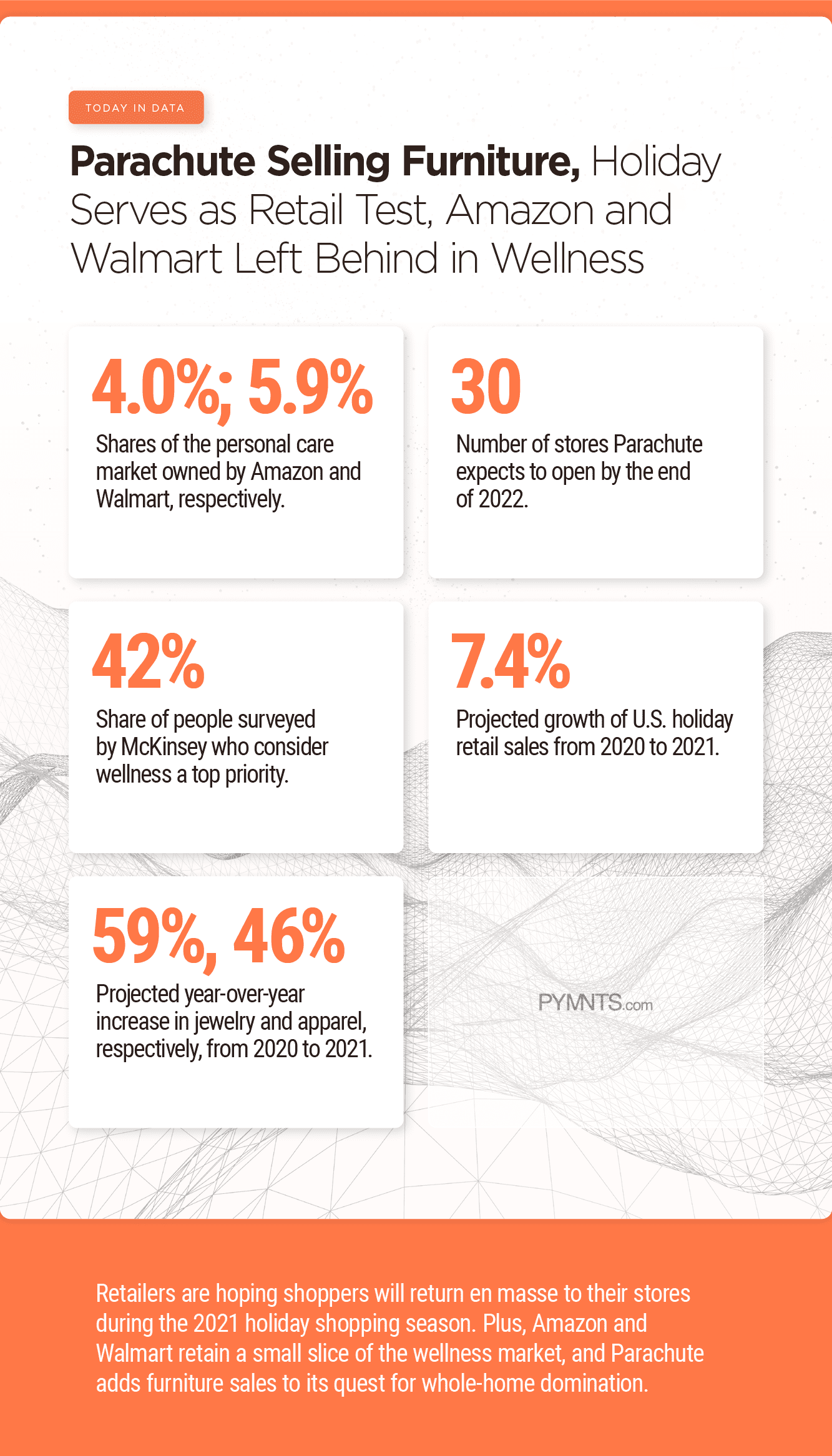 Retailers are hoping shoppers will return en masse to their stores during the 2021 holiday shopping season. Plus, Amazon and Walmart retain a small slice of the wellness market, and Parachute adds furniture sales to its quest for whole-home domination.