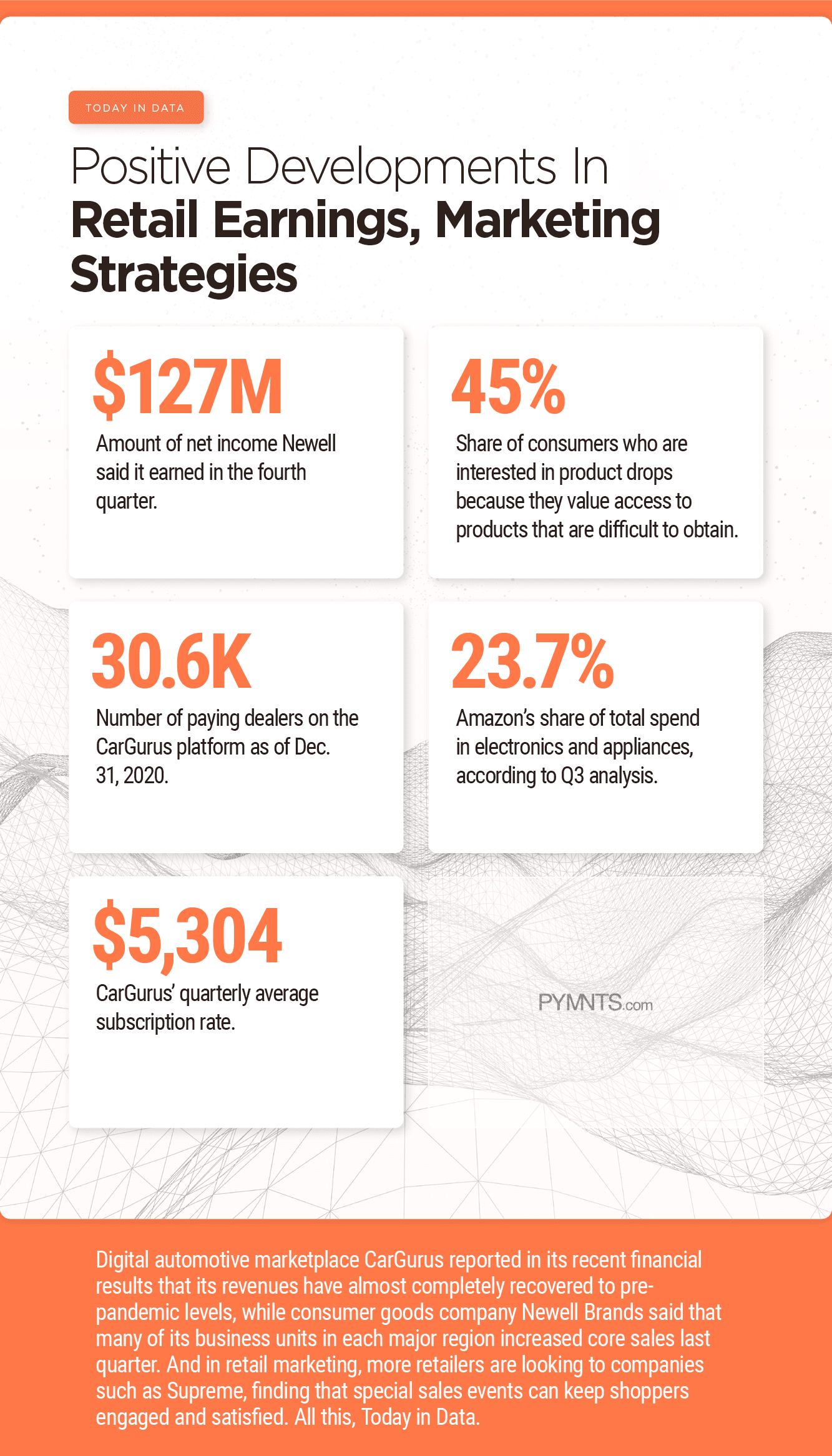 Digital automotive marketplace CarGurus reported in its recent financial results that its revenues have almost completely recovered to pre-pandemic levels, while consumer goods company Newell Brands said that many of its business units in each major region increased core sales last quarter. And in retail marketing, more retailers are looking to companies such as Supreme, finding that special sales events can keep shoppers engaged and satisfied. All this, Today in Data.