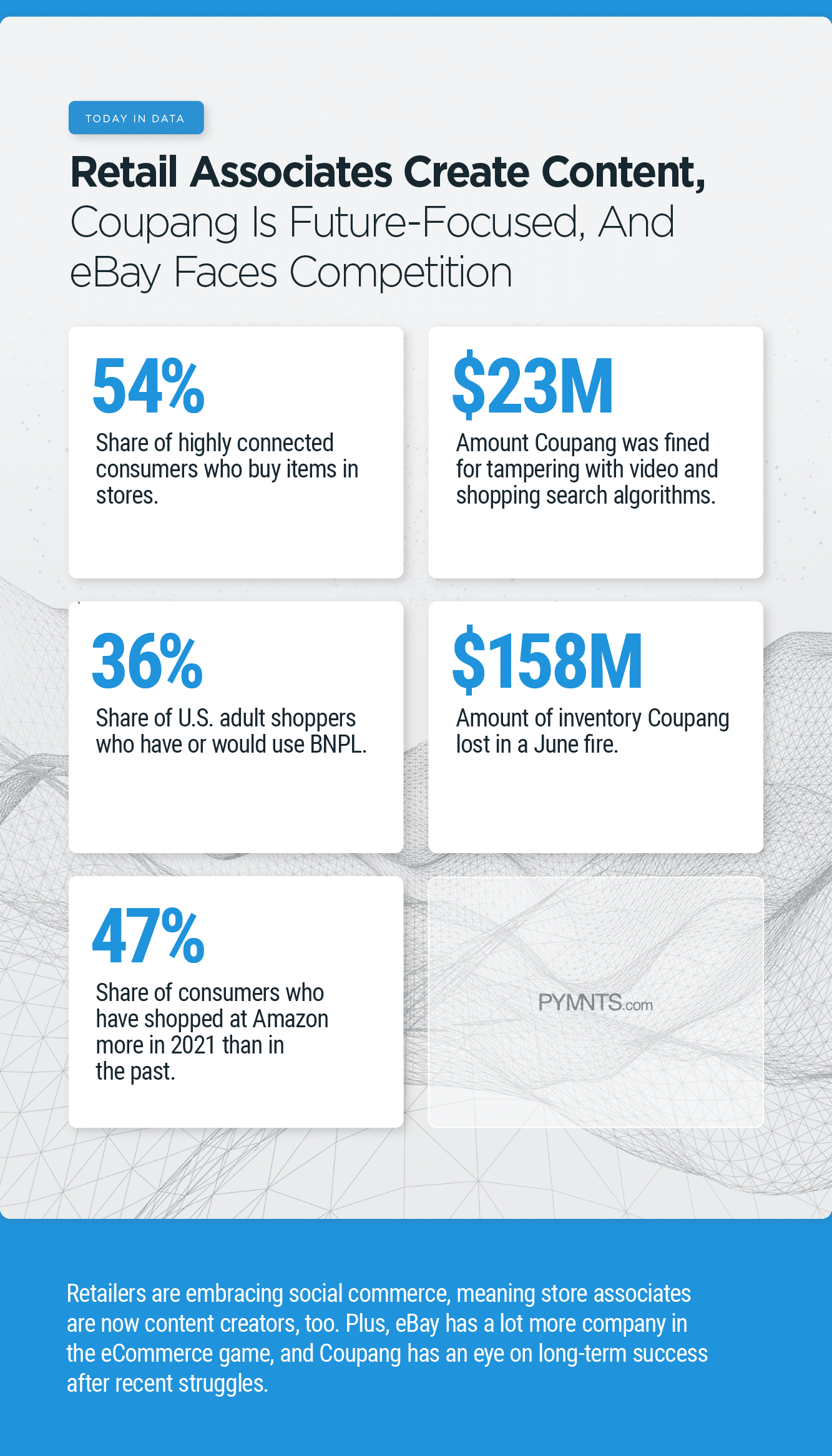 Retailers are embracing social commerce, meaning store associates are now content creators, too. Plus, eBay has a lot more company in the eCommerce game, and Coupang has an eye on long-term success after recent struggles.