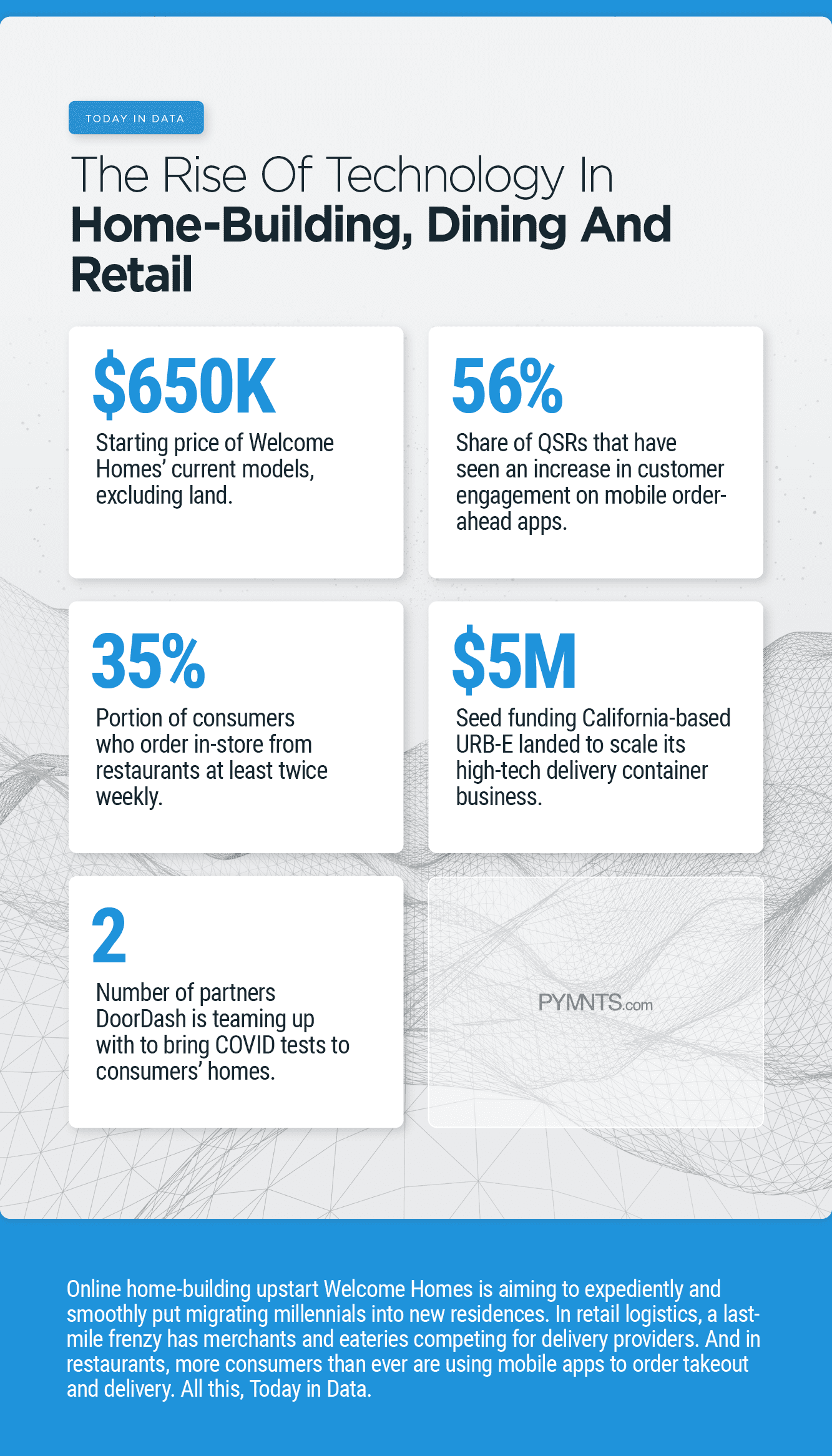 Online home-building upstart Welcome Homes is aiming to expediently and smoothly put migrating millennials into new residences. In retail logistics, a last-mile frenzy has merchants and eateries competing for delivery providers. And in restaurants, more consumers than ever are using mobile apps to order takeout and delivery. All this, Today in Data.