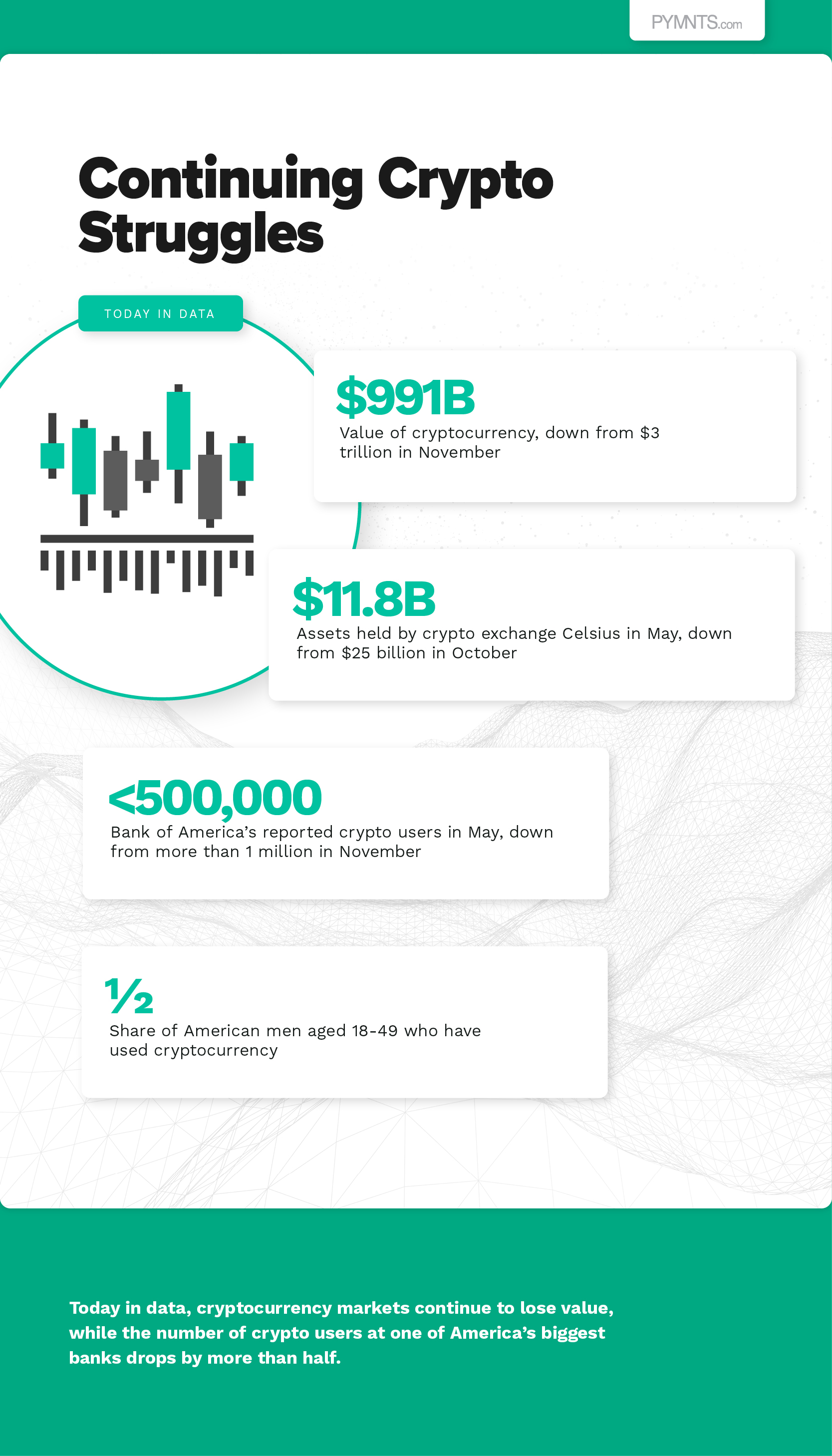 Today in data, cryptocurrency markets continue to lose value, while the number of crypto users at one of America’s biggest banks drops by more than half.