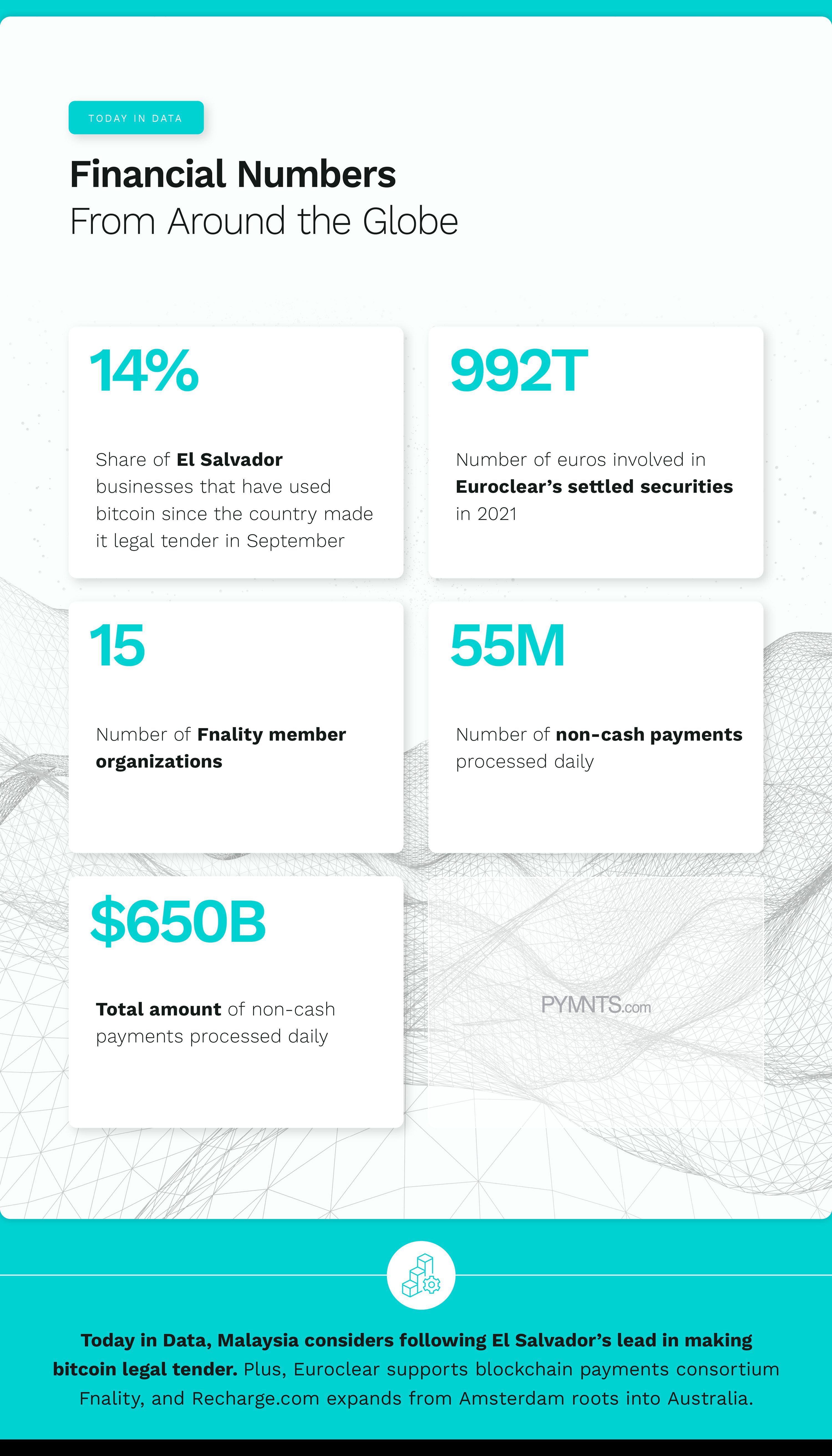 Today in Data, Malaysia considers following El Salvador’s lead in making bitcoin legal tender. Plus, Euroclear supports blockchain payments consortium Fnality, and Recharge.com expands from Amsterdam roots into Australia.