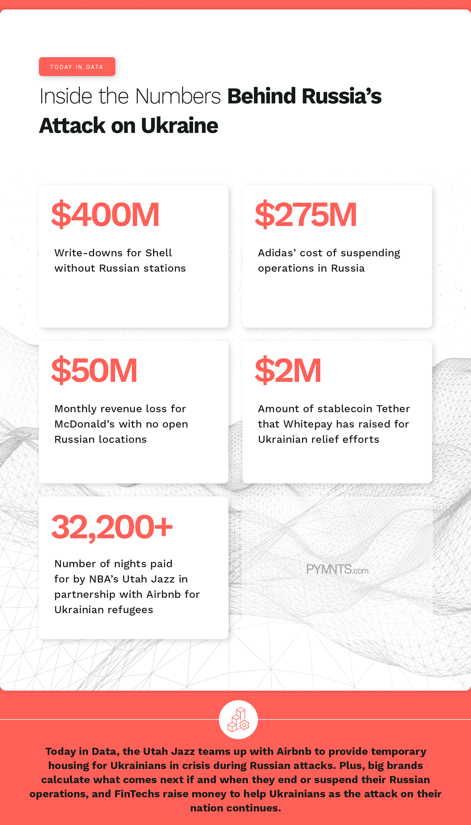 Today in Data, the Utah Jazz teams up with Airbnb to provide temporary housing for Ukrainians in crisis during Russian attacks. Plus, big brands calculate what comes next if and when they end or suspend their Russian operations, and FinTechs raise money to help Ukrainians as the invasion of their nation continues.