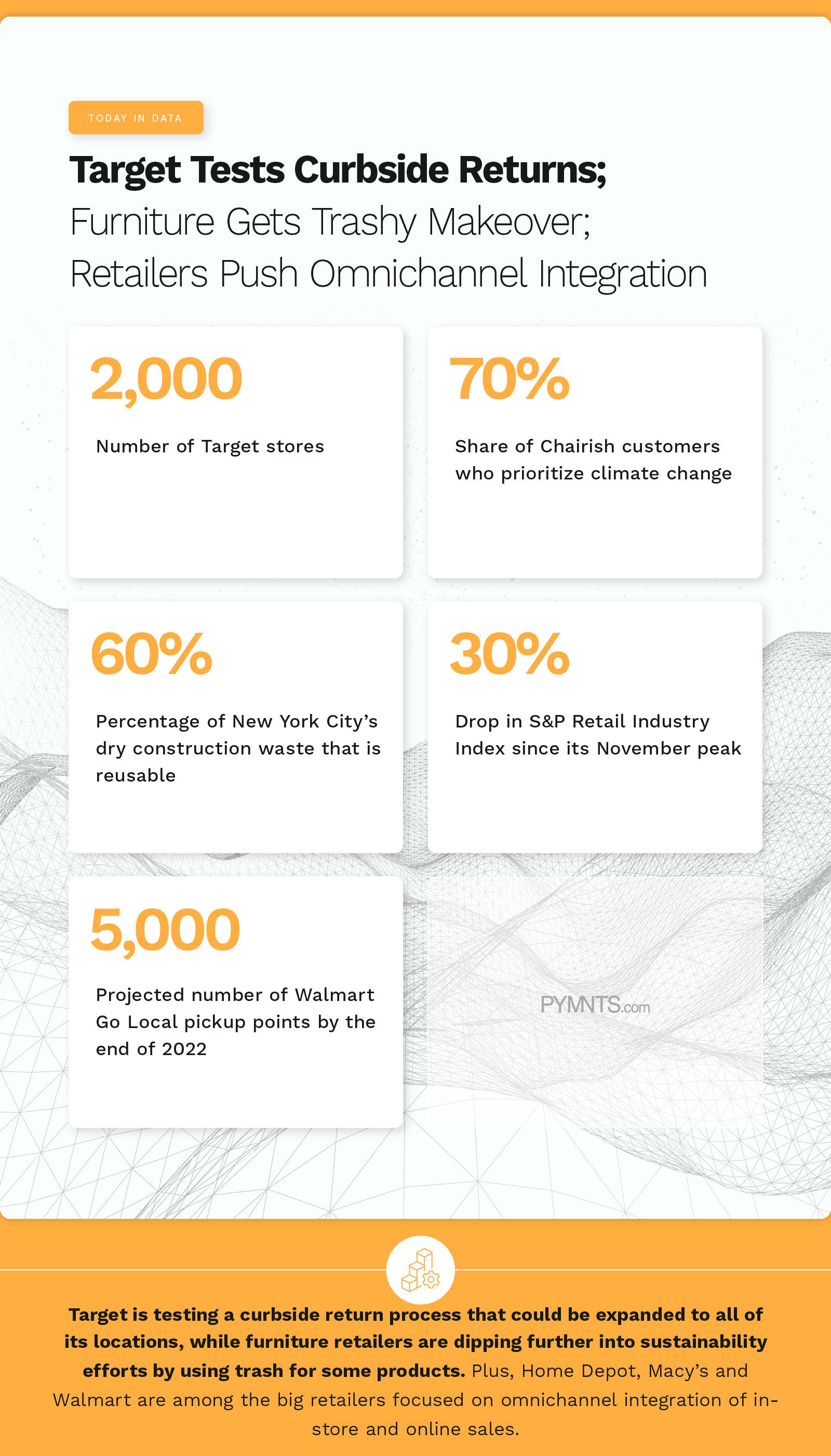 Target is testing a curbside return process that could be expanded to all of its locations, while furniture retailers are dipping further into sustainability efforts by using trash for some products. Plus, Home Depot, Macy’s and Walmart are among the big retailers focused on omnichannel integration of in-store and online sales.