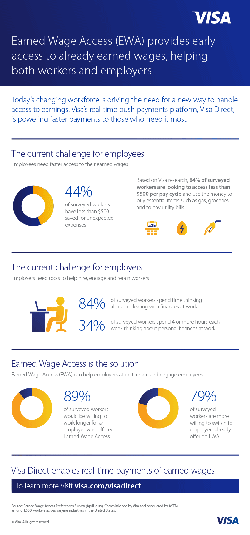 Visa is attempting to help by using its payments capabilities where they are needed most, giving hourly workers on the front lines access to their earned wages at the end of their shifts. For those workers, it is the difference between going home with groceries and having to tell their families to wait until payday to get what is needed.
